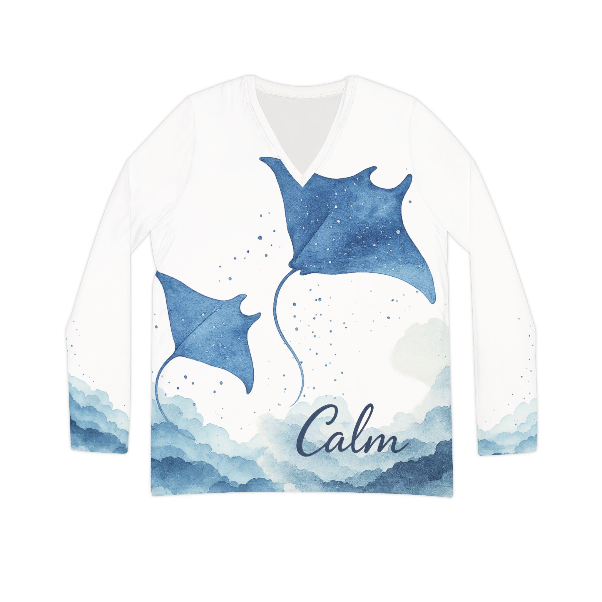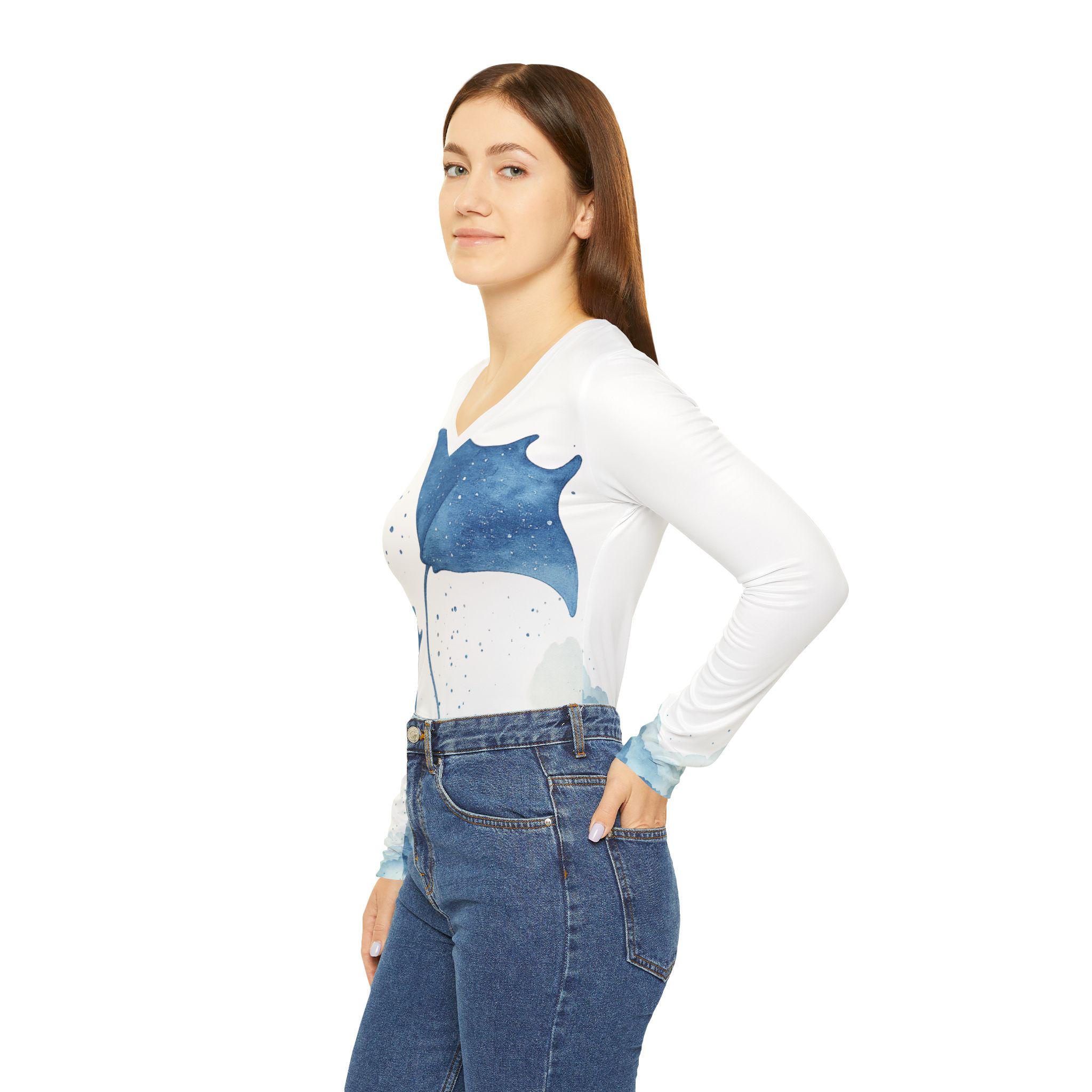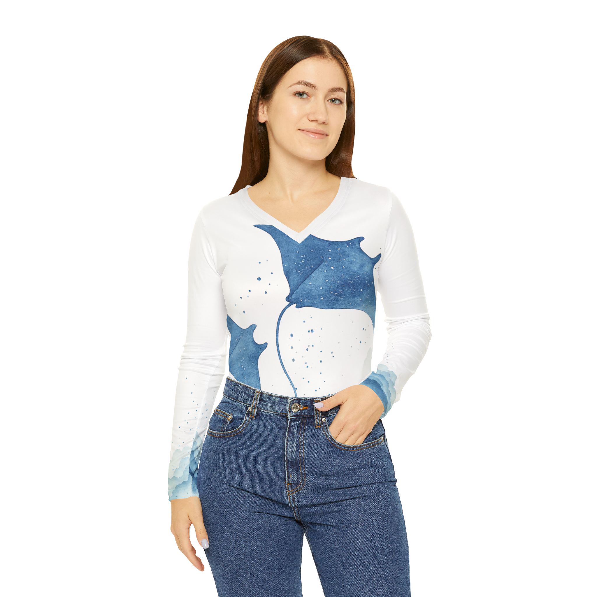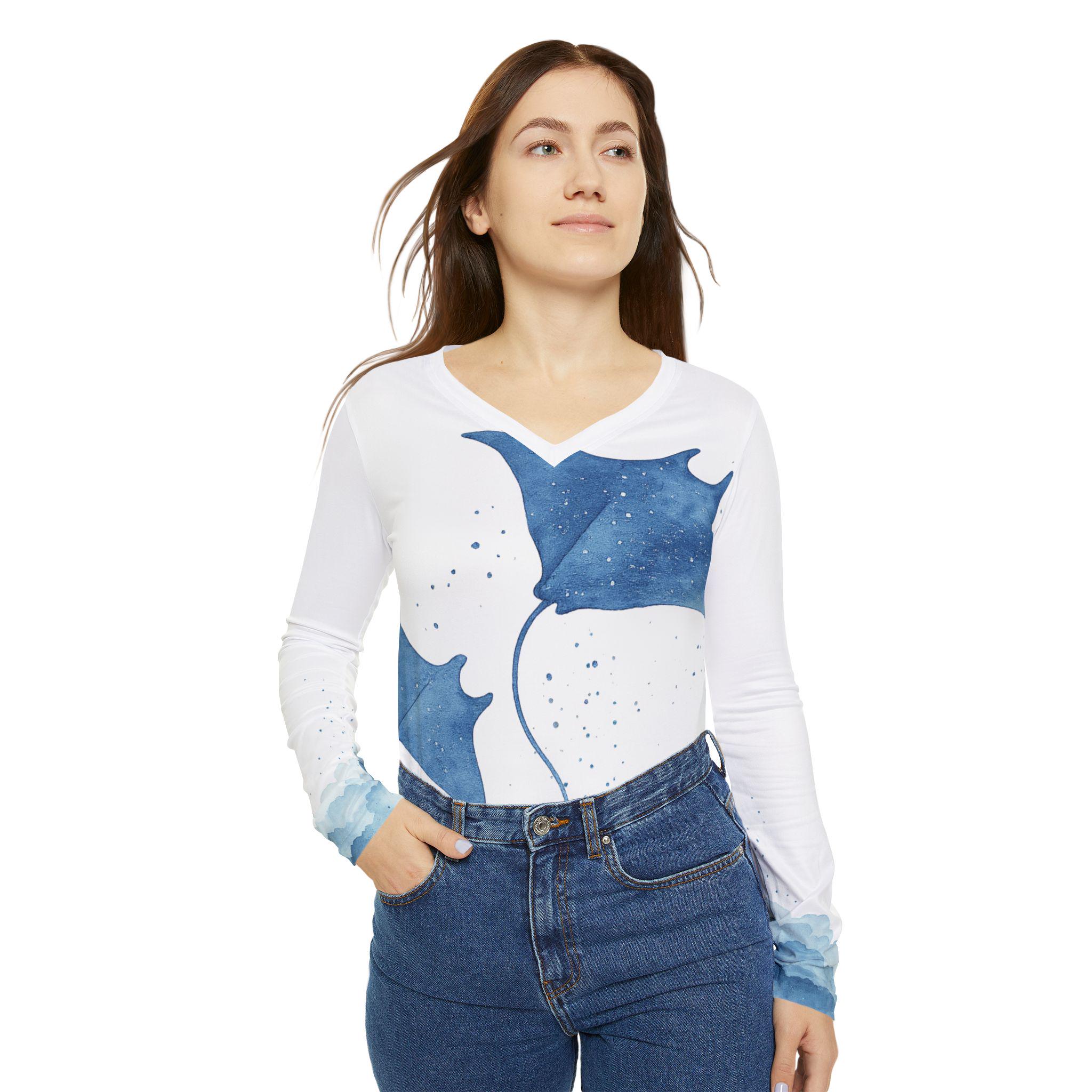 Embrace tranquility with our Women's Long Sleeve V-neck Shirt, designed to bring a calm and soothing vibe to your wardrobe. The elegant blue manta ray design floating through serene waves encapsulates a peaceful atmosphere, making it a perfect choice for relaxation or leisure activities. Ideal for women who appreciate comfort and style, this shirt is a seamless addition to your casual outings or cozy days at home. Whether you're enjoying a day at the beach, lounging with friends, or celebrating special moments, this shirt radiates a sense of peace and style. It's a wonderful gift for holidays, birthdays, or just because, ensuring you or your loved ones feel relaxed and stylish on any occasion.